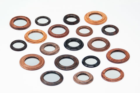 Spiegeltjes met houten lijst, buitendiameter van rond ca. 23 tot 35 mm.